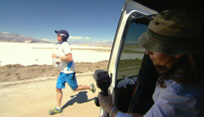 Leo attempts to run in the extreme heat with a doctor on standby to monitor his levels of dehydration.